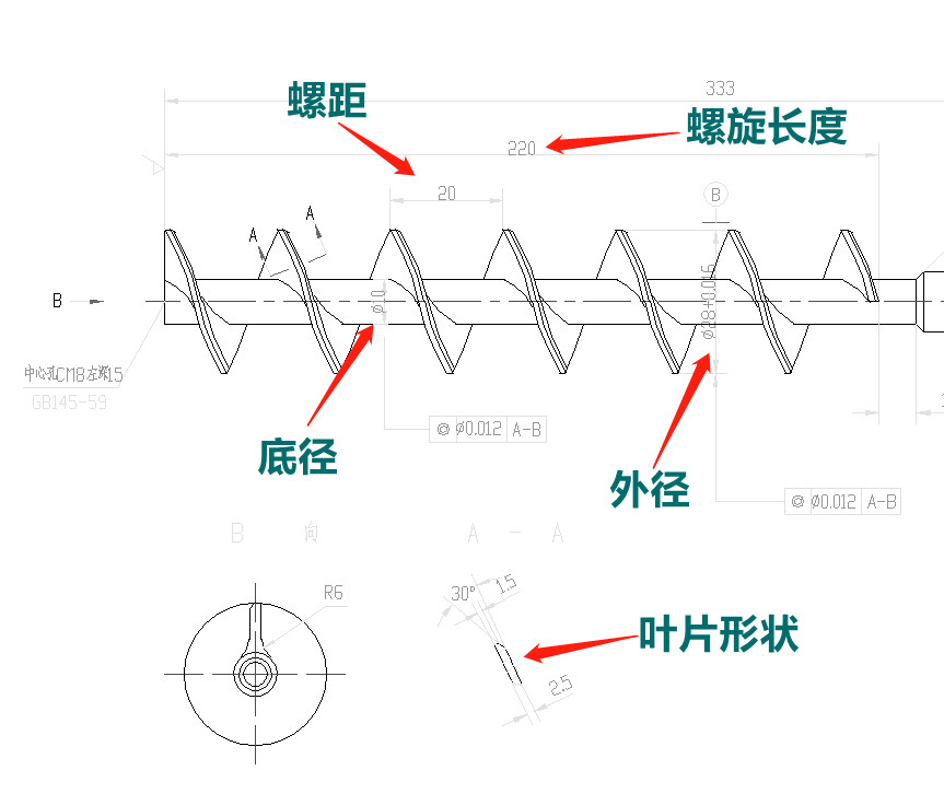 決定螺桿特性的主要有幾個關(guān)鍵尺寸:外徑、底徑、螺距、葉片形狀、葉片厚度、螺旋總長。
